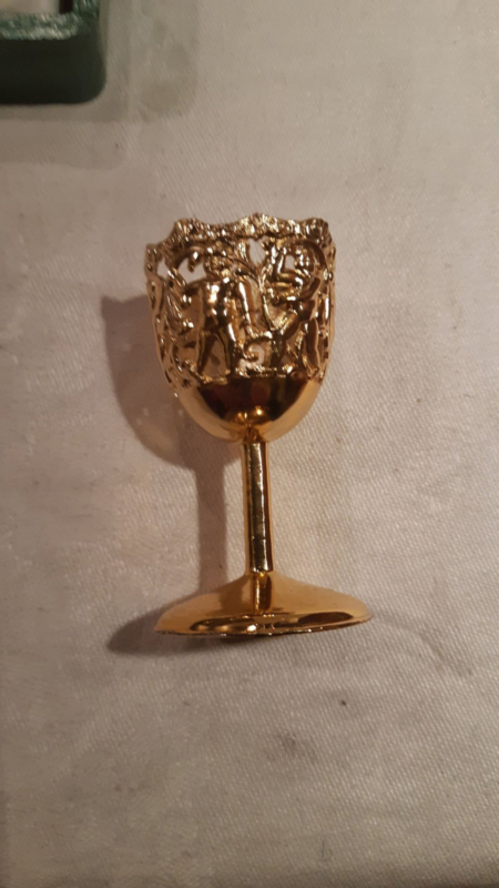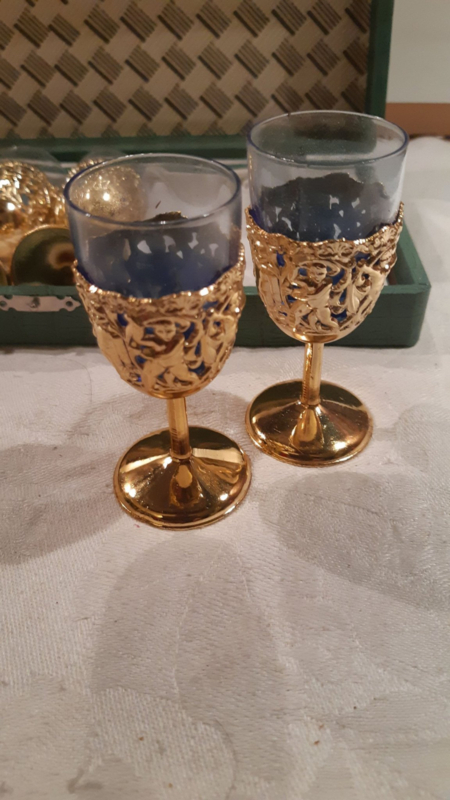Vintage Shot Glasses with Ornate Gold Holders – Set with Blue Glass Inserts & Presentation Box