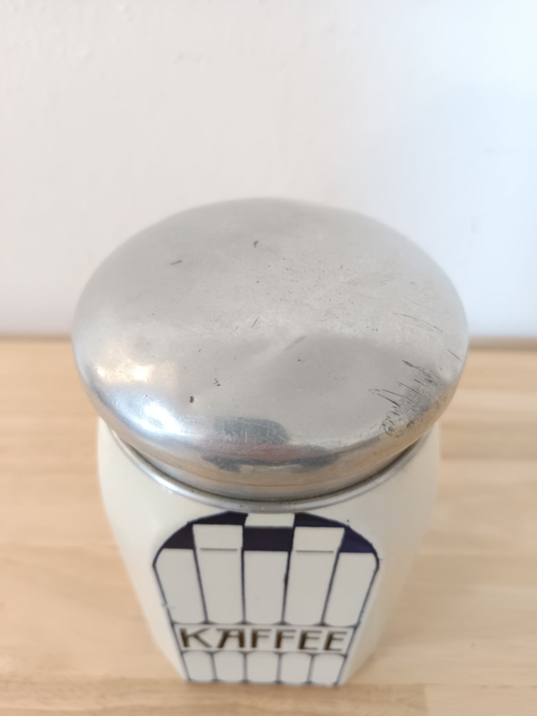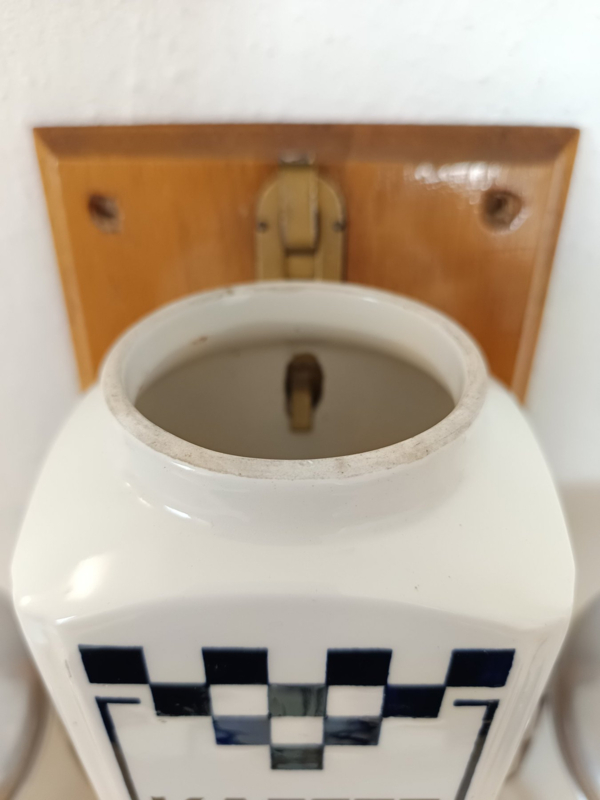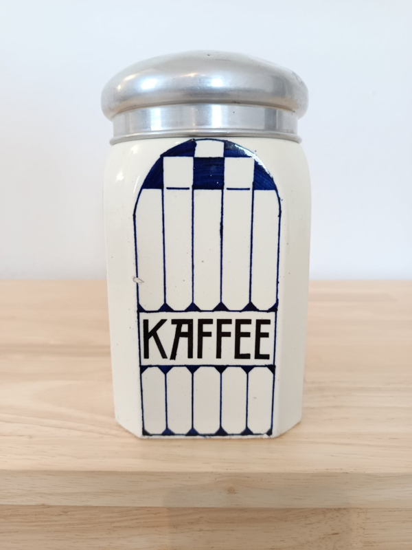 The grinder is accompanied by matching porcelain storage jars marked “KAFFEE” and “ZUCKER”, making this a charming and highly decorative ensemble, ideal for a farmhouse, country kitchen, or antique collection.
