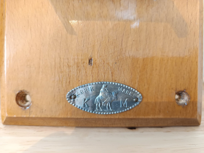 An authentic vintage wall-mounted coffee grinder, crafted with a wooden body, porcelain hopper marked “KAFFEE”, and original glass collection jar. This fine example features a hand-operated metal grinding mechanism and retains its original maker’s badge marked K&M, indicating European manufacture.