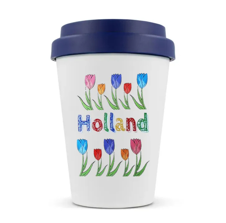 mooie koffie togo bekers dubbelwandig van keramiek met afluitbare deksel en boerenbont motief....